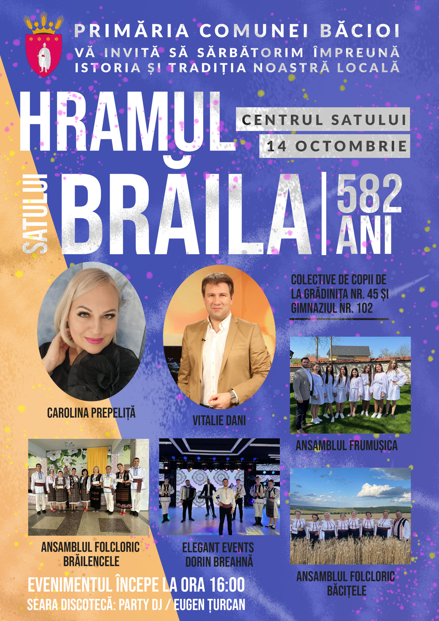 Marți, 14 octombrie, Primăria com. Băcioi, în parteneriat cu Centrul de Cultură și Tineret Băcioi, vă invită la concertul „Hramul satului Brăila – 582 de ani”, dedicat sărbătorii „Acoperământului Maicii Domnului”, ziua în care s-a sfințit prima piatră de temelie a bisericii din localitate.